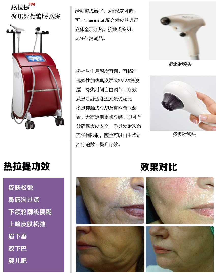 熱拉提:采用聚焦射頻。一般的射頻只能達(dá)到皮膚表層、真皮層,但達(dá)不到真皮層以下的筋膜層,而熱拉提的深度可以達(dá)到筋膜層。所以熱拉提可以起到提拉臉部的作用。另外聚焦射頻比一般的射頻能量更集中,所以能量比一般射頻更大,效果更好。